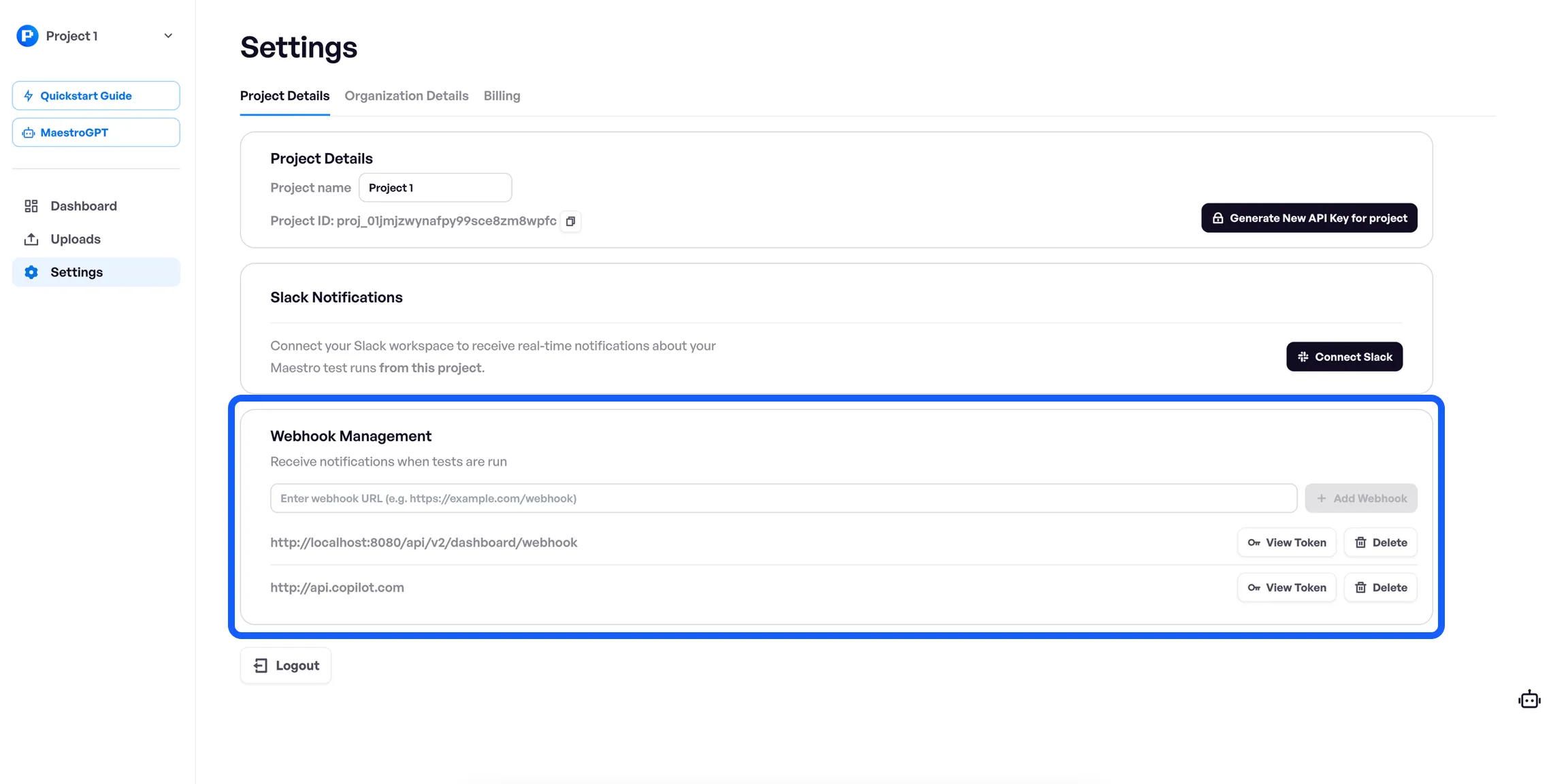 - Head to your Project Settings in the Maestro Console and enter your Webhook URL (make sure it can receive POST requests and is publicly accessible)