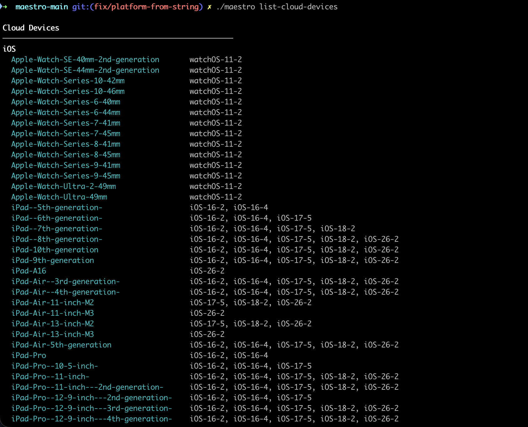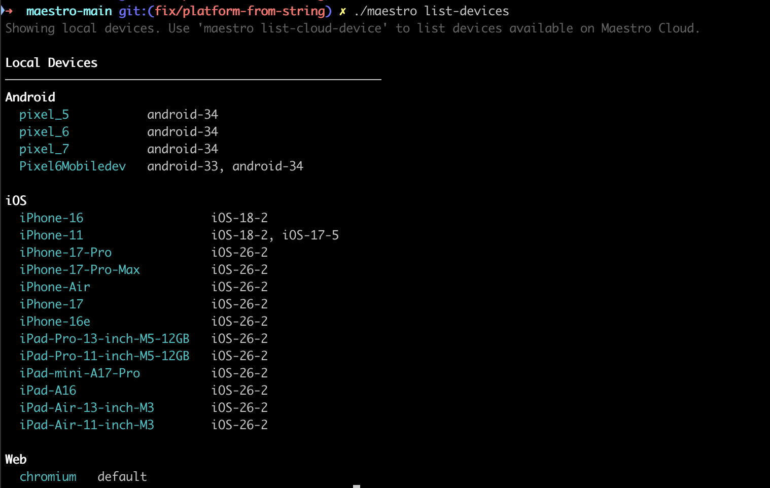 The iOS device catalog also got a significant expansion. iPhone 13 Mini and iPhone 16 Pro Max are in - two of the most requested models. Run maestro list-cloud-devices --platform=ios to see the full list.