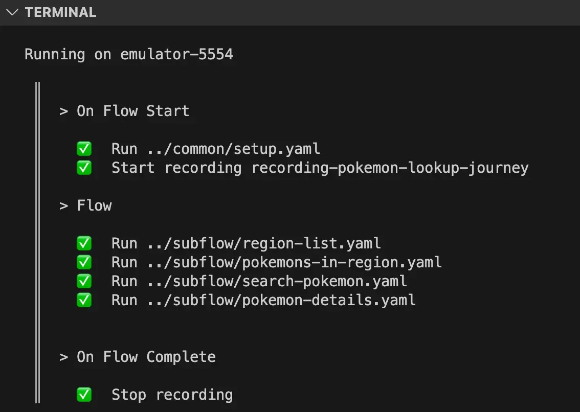 appId:This is the app id of the app you want to test, which can be found in theapp.jsonfile of your app.onFlowStart: This is a list of actions to perform before the test starts. In this case, we are running a setup flow and starting a recording.onFlowComplete: This is a list of actions to perform after the test completes. In this case, we are stopping the recording.runFlow: This is a list of subflows to run. In this case, we are running subflows to check the region list, Pokemon in a region, search for a Pokemon, and check Pokemon details.