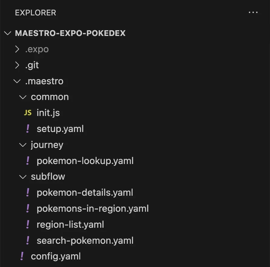 In this guide, we will structure our tests by journey and subflow. Create a journey directory in the .maestro directory. This is where we will write our tests, which will refer to subflows. Subflows can be self-contained meaning they could be run as a Flow individually using maestro testor they could be simply separated into reusable parts of a bigger Flow.