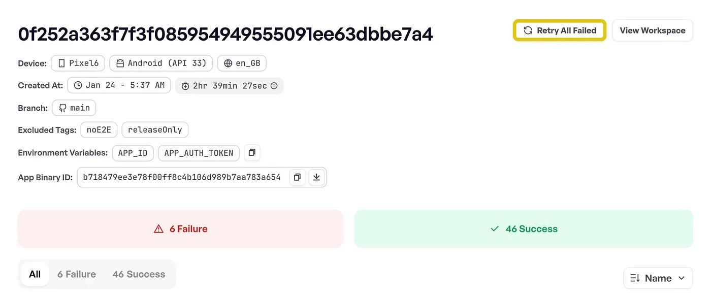 Yeah, it’d be great if every test passes every time, and were always super-stable. But there’s flaky tests, and infrastructure outside of our control, and other sources of failures that we can’t be sure are app problems. We previously had the ability to retry an individual flow, adding to the end of the queue to be run on your dedicated devices. That wasn’t very convenient if you have a whole bunch of tests, and the test server went offline. We’ve added a Retry All Failed button to the view of an upload that’ll batch up a retry for all failures within that run.