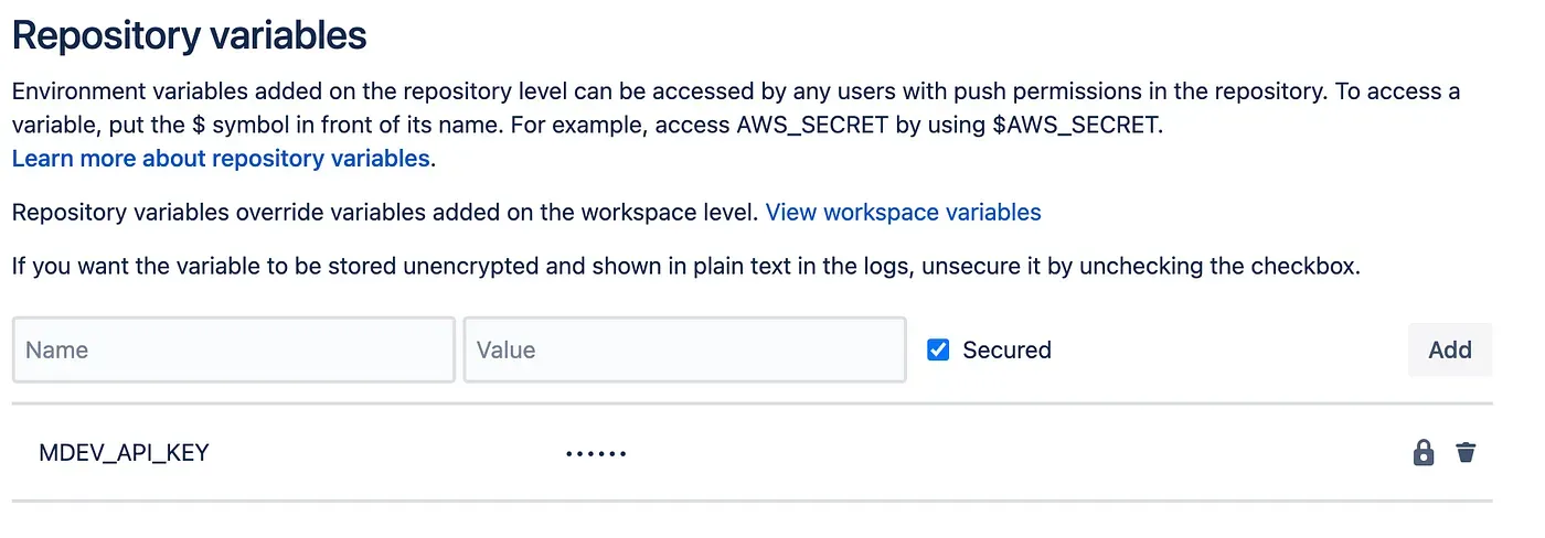 In order to use the Maestro Cloud Pipe, youβll need to add the API key as a secret ENV in your Bitbucket repository.
