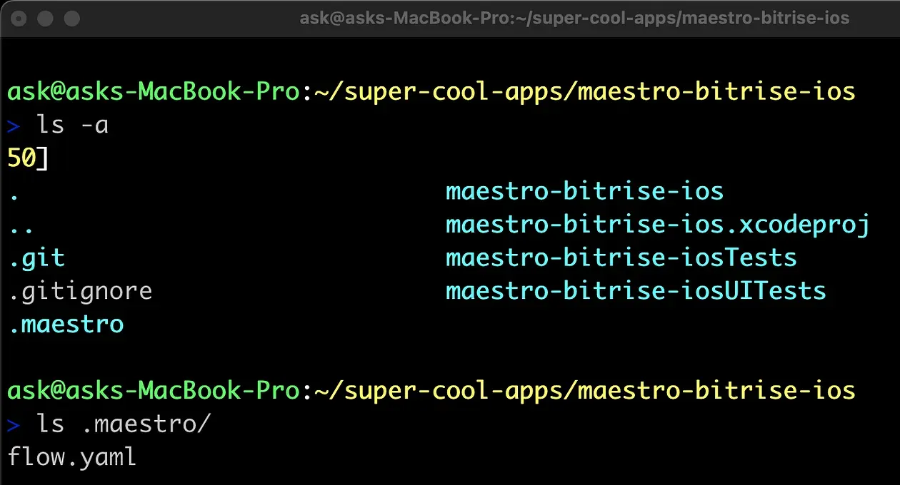 1. Go back to your Xcode project, and create a directory named .maestro, and create a new file flow.yaml inside it.