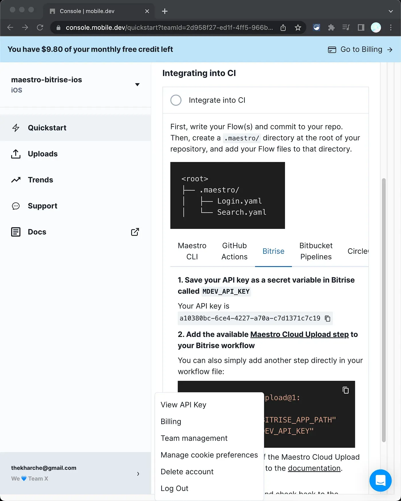 3. Copy the API key of your Maestro Cloud account. You will need this later for Bitrise integration.