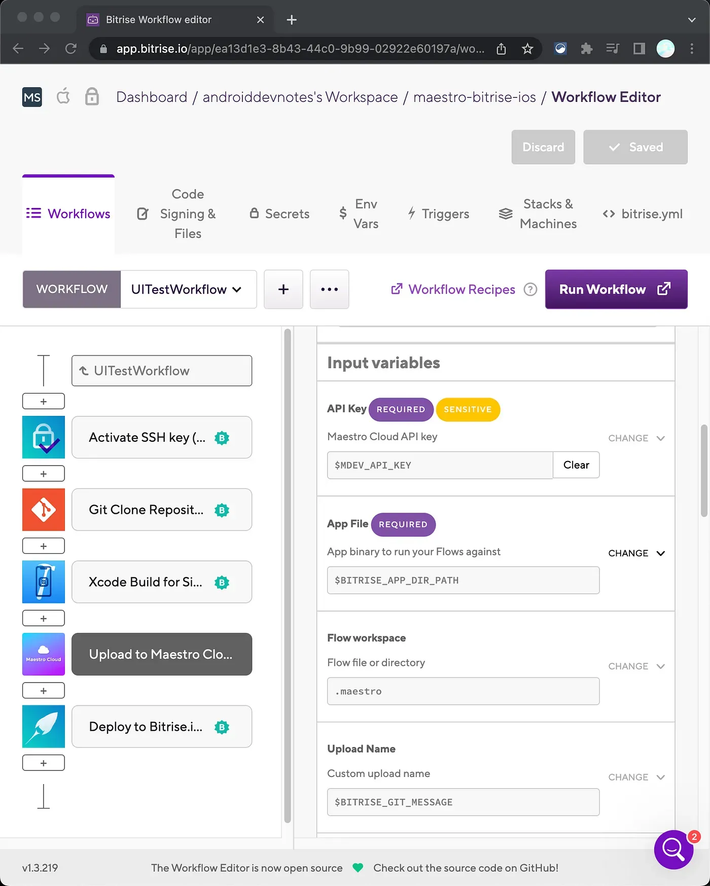 4. Go to your Bitrise project’s Workflow Editor and add the Maestro Cloud API key as a secret environment variable.