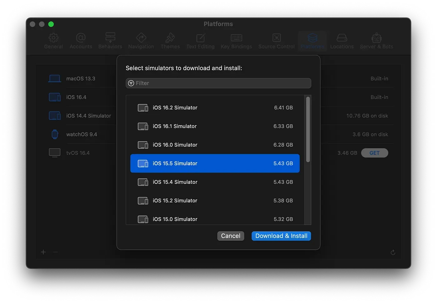 Required runtime to create the simulator is not installed: iOS-15-5