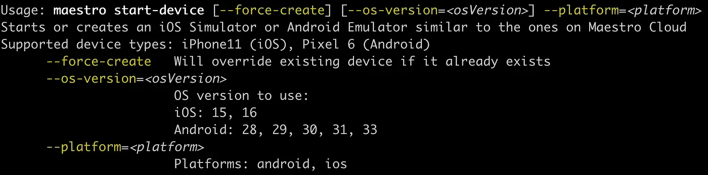 maestro start-device [--force-create] [--os-version=<osVersion>] --platform=<platform>
